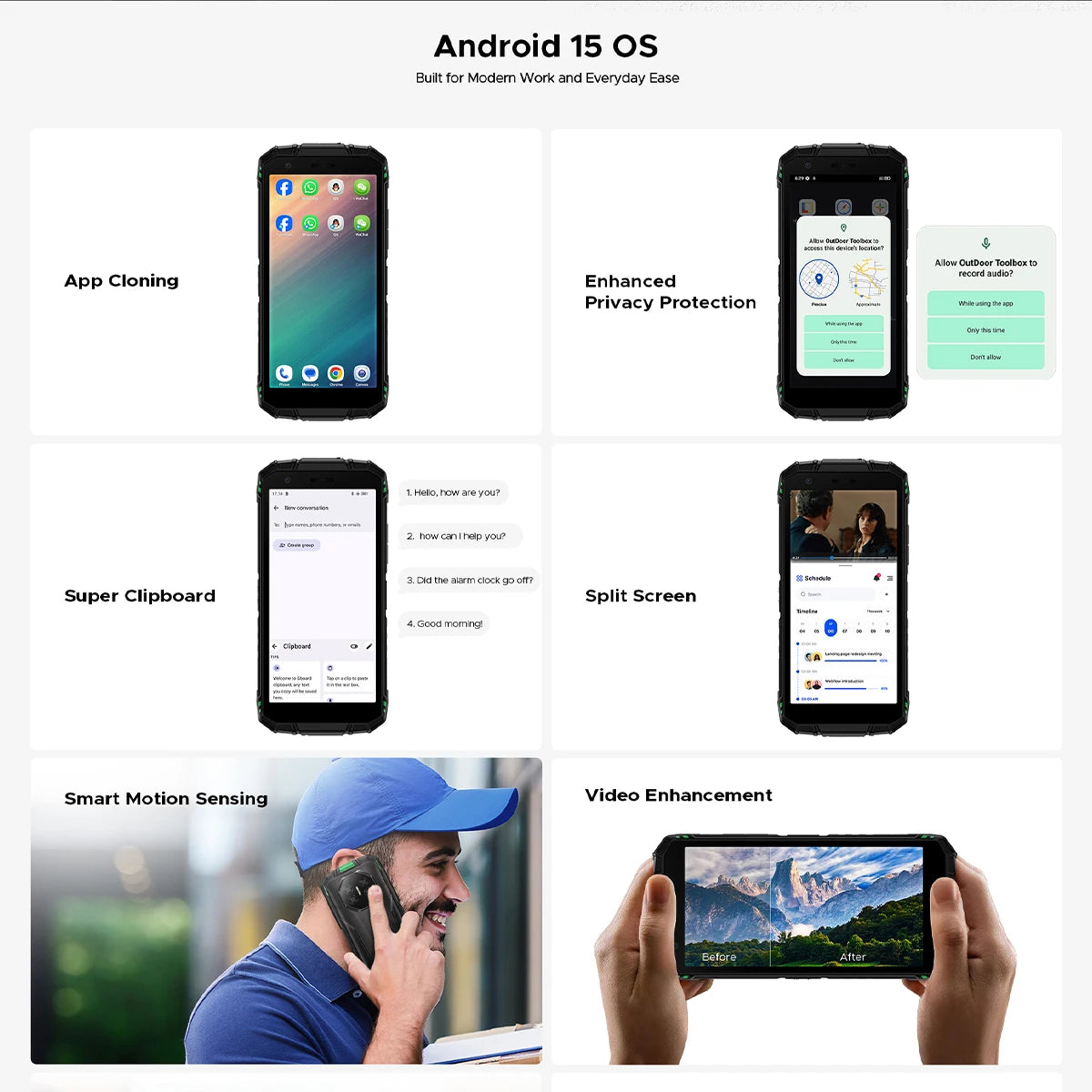Il fonctionne sous Android 15, avec accès au Google Play, permettant d’installer les applications essentielles (appels, messages, GPS, apps pro, paiement sans contact).